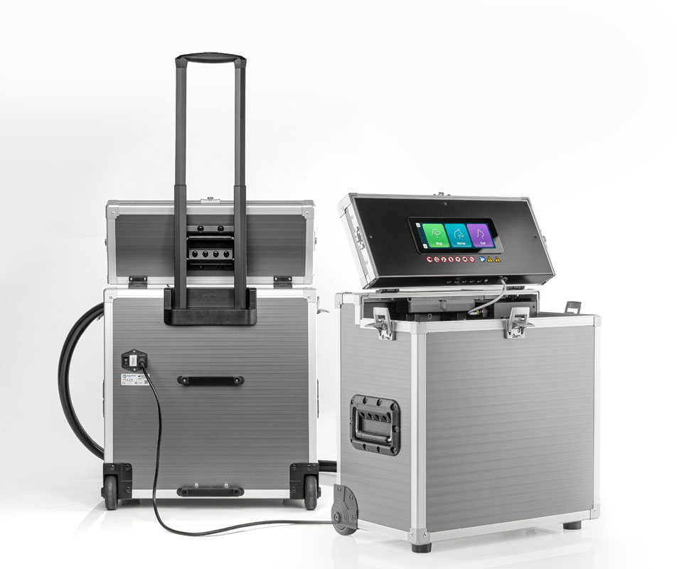Het deksel is opklapbaar voor een gemakkelijke bediening van het touchscreen-display. De technische inbouwdelen bevinden zich in het onderste deel van de koffer, met stroomaansluiting. Trolleyvariant voor handzaam en veilig transport.