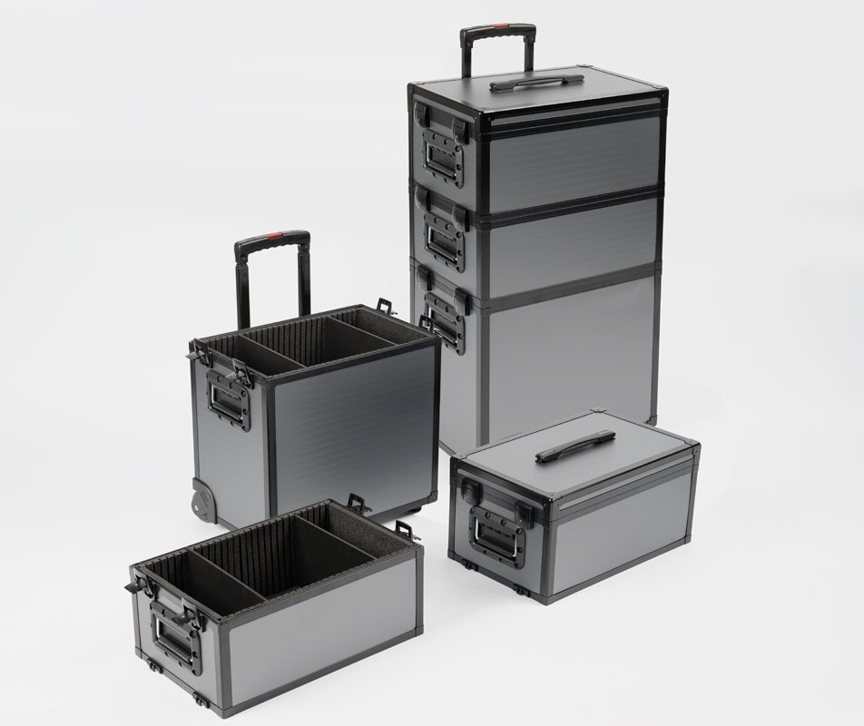 Trolley met op maat gemaakte afzonderlijke koffers voor het transport van een complete collectie. Een telescopische handgreep, hoekwielen, zijdelingse cargogrepen en verbindingssloten maken het transport en de presentatie eenvoudig.